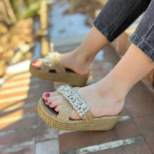 null صندل کنفی لژدار شیک مرواریدی زنانه دخترانه کفش حصیری تابستانی مجلسی ( 2500 )