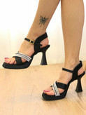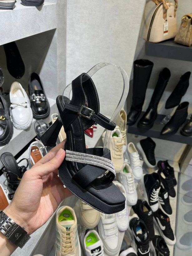 کفش پاشنه بلند ساتن مشکی نگینی زنانه دخترانه صندل پاشنه دار نگیندار ( 335 )