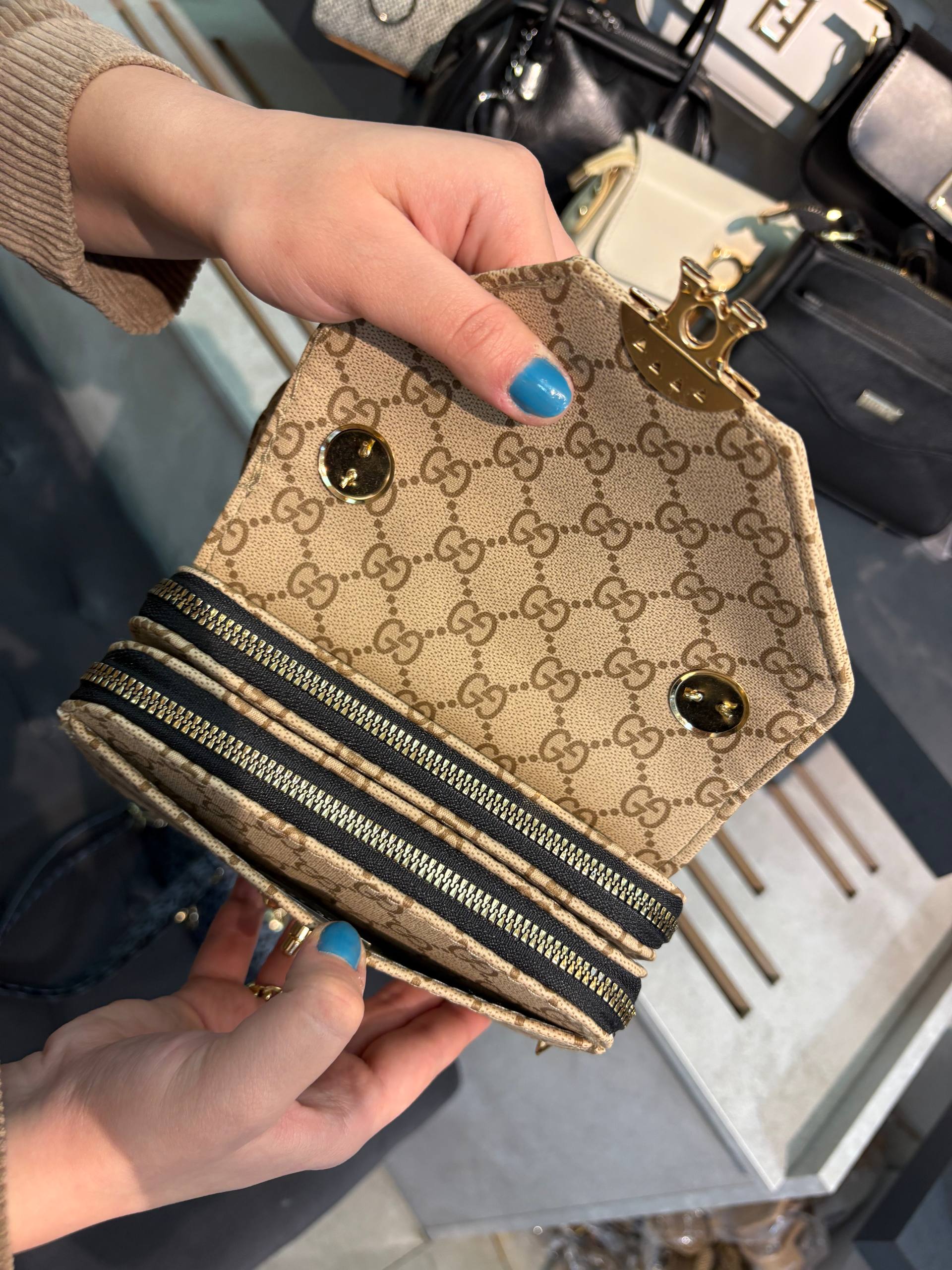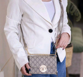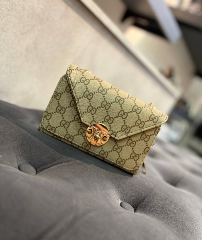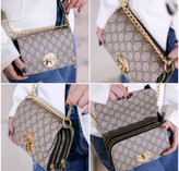 کیف دوشی و دستی طرحدار گوچی مشکی و کرم زنجیری مجلسی زنانه ( 537 )